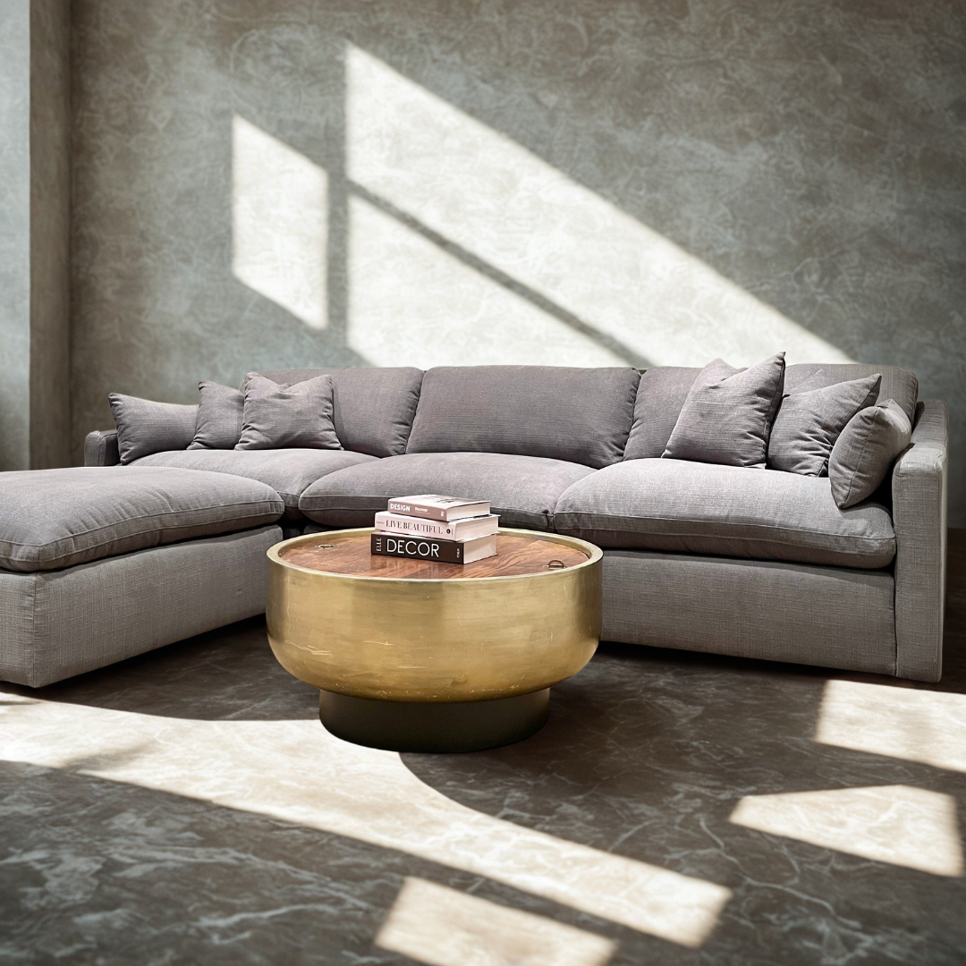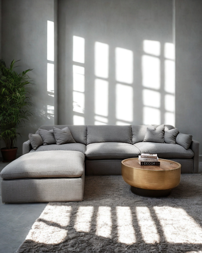 Featuring a plush cloud-like design, reconfigurable modular sectional pieces, seat cushions are overstuffed filled with premium down feathers and wrapped in soft feel high-performance gray weave upholstery, this couch is perfect for relaxing and entertaining. Its elegant sloped arms mimic the world famous RH cloud couch, which adds a refined sophistication to your living space.