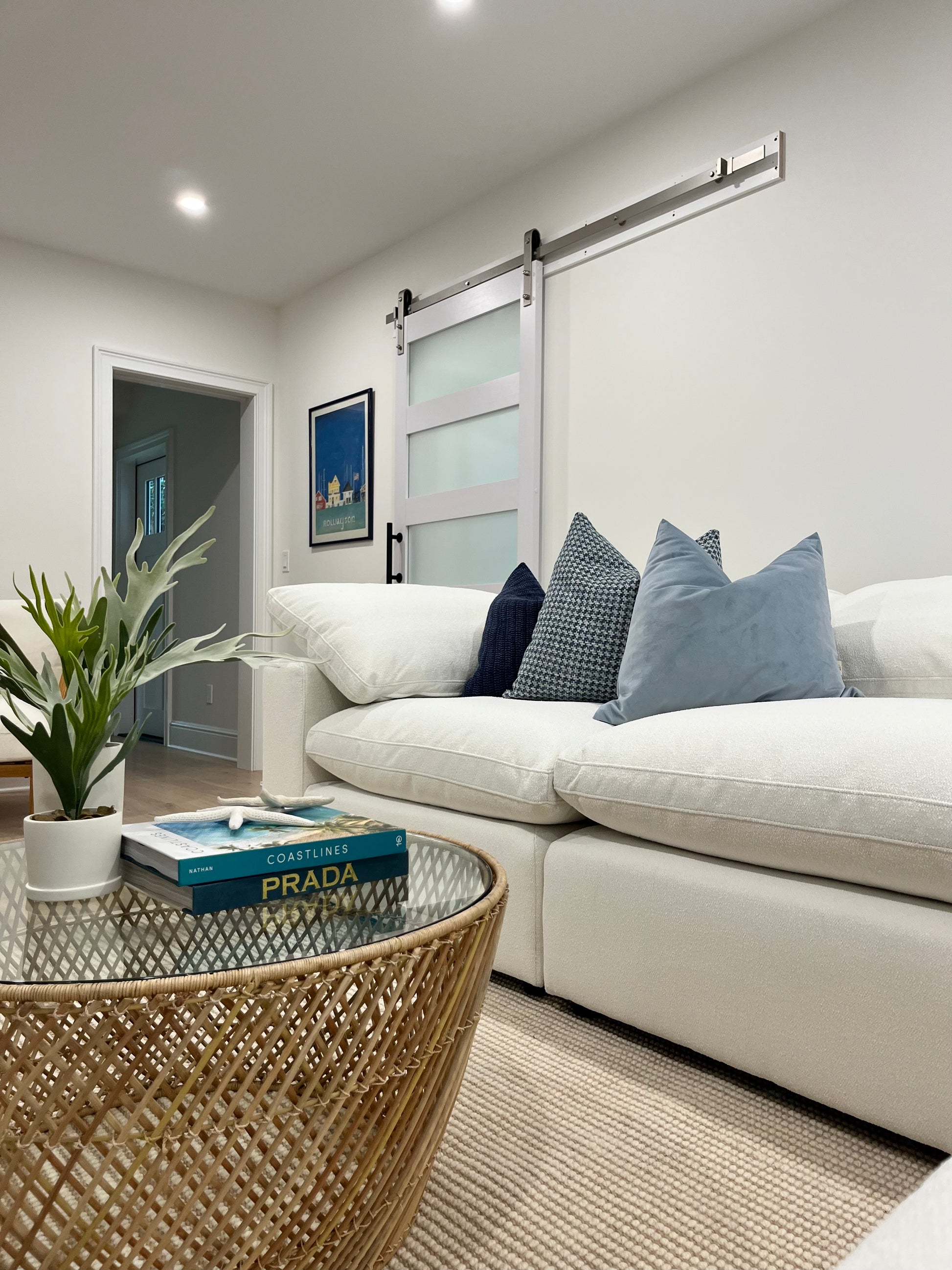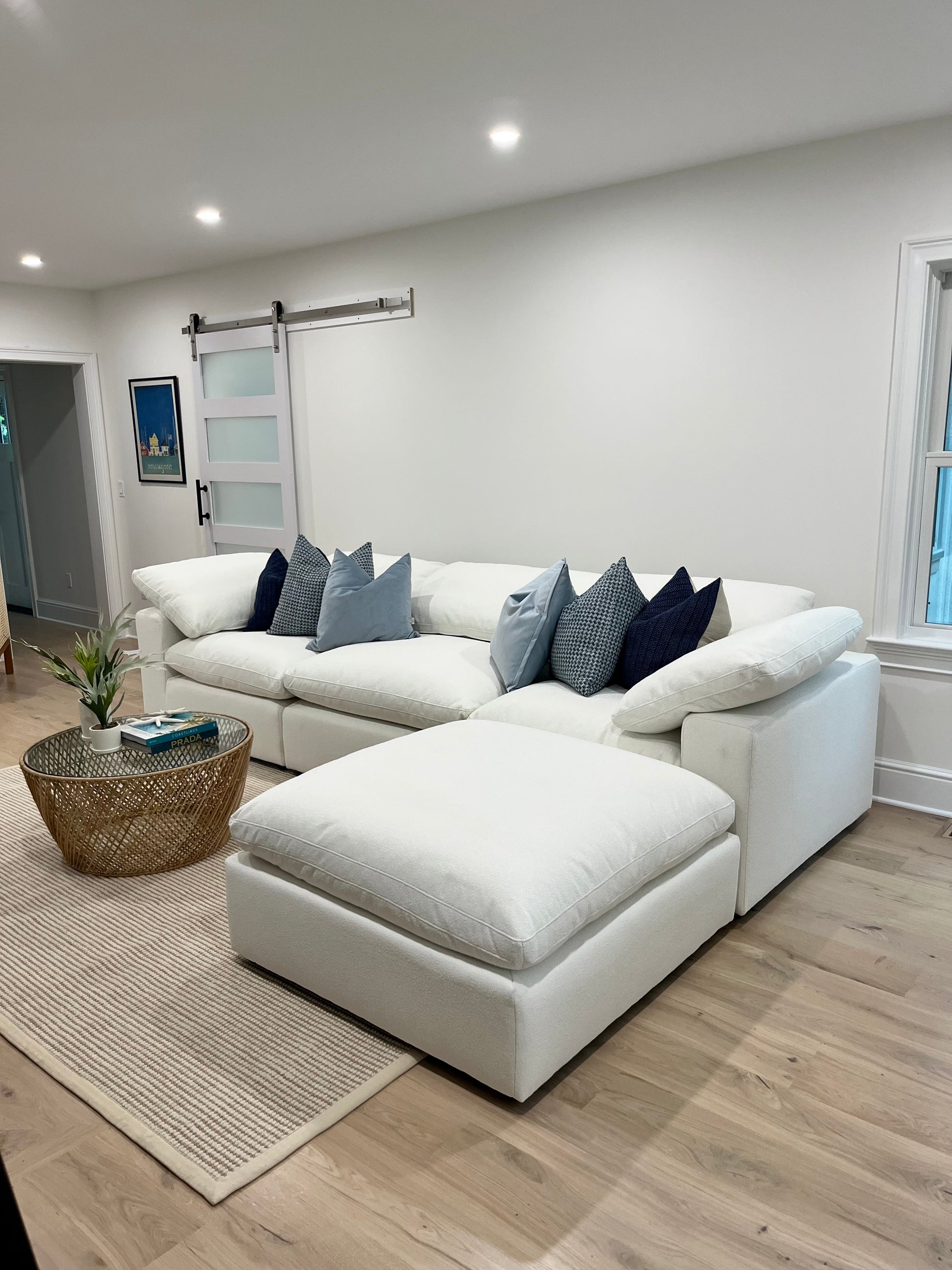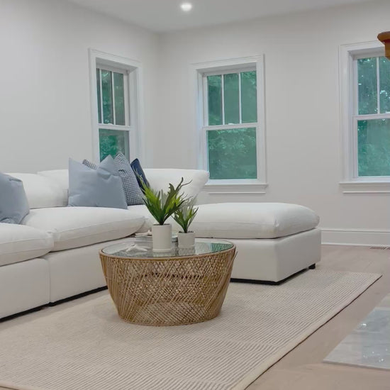 Featuring a plush cloud-like design, reconfigurable modular sectional pieces, seat cushions are overstuffed filled with premium down feathers and wrapped in high-performance ivory off-white boucle fabric, this couch is perfect for relaxing and entertaining.